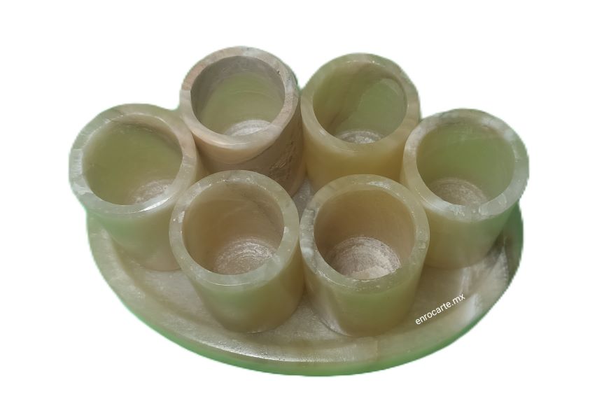 DESCRIPCIÓN: Juego de seis vasos tequileros y charola de servicio tallados en ónix. Al tratarse de artículos elaborados en piedra natural, puede haber una ligera variación en el color y vetas.