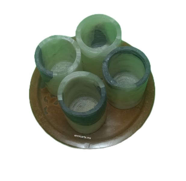 DESCRIPCIÓN: Juego de cuatro vasos tequileros y charola de servicio tallados en ónix. Al tratarse de artículos elaborados en piedra natural, puede haber una ligera variación en el color y vetas.